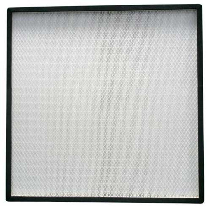 ULPA級超高效過濾器,或稱超低穿透率空氣過濾器,由美國進口防水阻燃的玻璃纖維濾紙組成用一種氨基醋膠把濾料固定在質輕的酸沙鋁擠型材框架上,在進風面和出風面都可以裝有噴塑的護面網,以保護濾紙不被破壞。對0.1~0.2μm的微粒、煙霧和微生物等塵埃粒子的過濾效率達到99.999%以上。